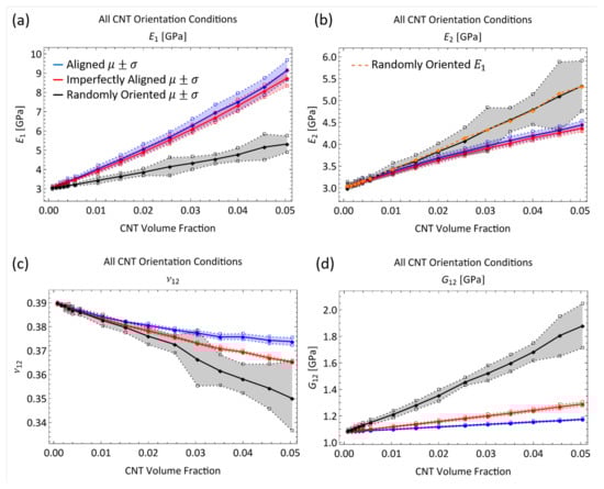 - Mechanical reinforcement in the direction increased with the degree of alignment ( aligned > imperfectly aligned > randomly oriented) for all CNT volume fractions. On the other hand, mechanical reinforcement in the direction increased with the degree of misalignment (randomly oriented > imperfectly aligned > aligned) for all CNT volume fraction. This was found to be true for both the stiffness terms and and for the engineering constants and . With increasing CNT volume fraction, the difference in the stiffness estimates of the aligned case with respect to the randomly oriented case grew larger. At the final simulated CNT volume fraction of 5.04%, this difference for was 72.80% and for was −15.16%.
