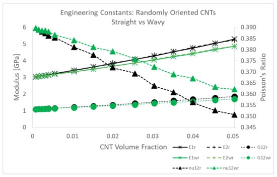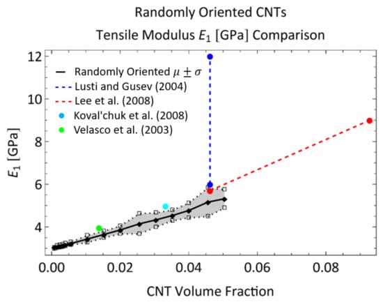 The improvement in the mechanical properties of CNT/polymer nanocomposites has been demonstrated through multiple experimental and modeling studies. The trends observed for the engineering constants for the aligned cases was compared with other characterization efforts in the initial study []. In the present work, the engineering constants for the randomly oriented cases are compared with other works in the literature. Since the densities of CNTs ( []) and epoxy () are very similar to each other, the values for volume fractions and weight fractions for CNT/epoxy composites can be expected to be very similar. The relation between the weight fractions and densities can be computed as follows