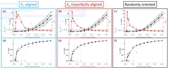 The mean, mean ± standard deviation and coefficient of variation are depicted in black, grey and red, respectively, for for (a) straight aligned CNTs, (b) straight imperfectly aligned () CNTs and (c) straight randomly oriented cases, respectively. The mean and mean ± standard deviation are depicted in black and grey, respectively, for in semi-log plots for (d) straight aligned, (e) straight imperfectly aligned and (f) straight randomly oriented cases, respectively.