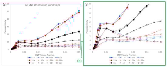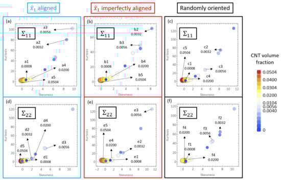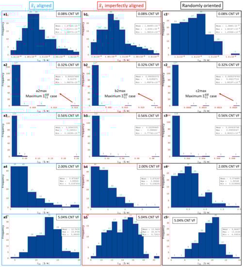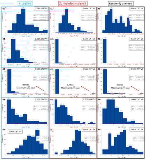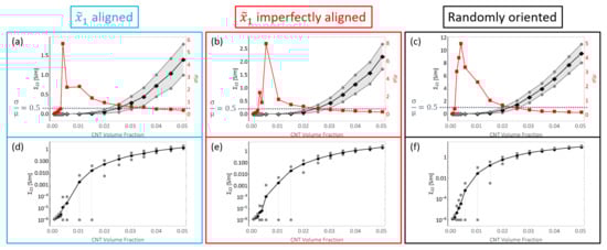 It is noteworthy that the increase in is similar for the aligned and imperfectly aligned cases. This can be seen in the estimate plots (Figure 13a,b) and semi-log plots (Figure 13d,e) with the mean value reaching as high as and for the aligned and imperfectly aligned cases, respectively, at 5.04% CNT volume fraction.