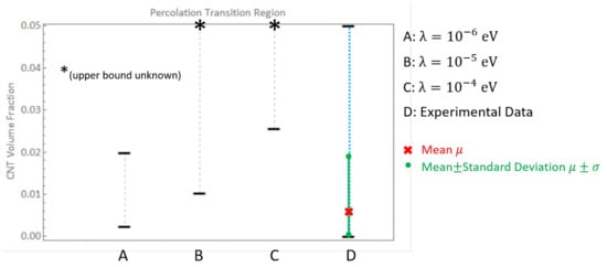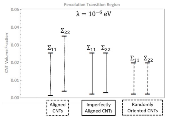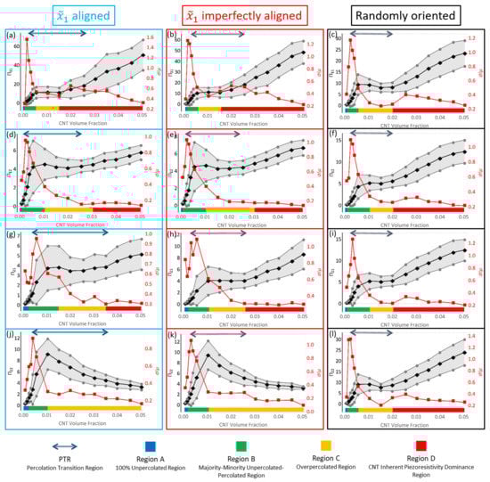 The increase in for the randomly oriented case is notably lower than the aligned or imperfectly aligned cases with the mean value reaching as high as obtained at 5.04% CNT volume fraction. The estimates for are lower for the randomly oriented cases due to the effects of alignment since in this case there is an equal probability of forming conductive pathways in the aligned or transverse directions, thereby reducing the total number of paths in the alignment direction.