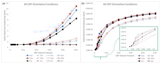 - The estimates for the initial electrical conductivity terms and increased by several orders of magnitude to values higher than with increasing CNT volume fraction. The enhancement in was found to be consistently larger with increase in the degree of alignment and vice versa for for all CNT volume fractions. At the final simulated CNT volume fraction of 5.04%, and for the aligned case were 32.54% larger and 85.38% smaller than their corresponding values for the randomly oriented case.