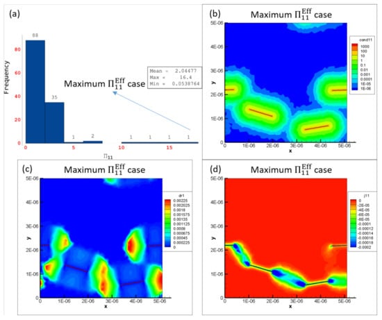 For every orientation case and volume fraction, a total of 224 processors across 14 compute nodes were used in parallelization type 1 for the generation of a 130 realizations. In the aligned study [], computation time reduced by a factor of approximately 100 due to the implementation of type 1 parallelization for the maximum volume fraction simulated of 5.04%. In the present work, this reduction factor increased to approximately 1000 for the randomly oriented straight case and the randomly oriented wavy case. This is because of the sequential process of seeding CNTs. A new CNT is seeded into the domain only if it does not interpenetrate with any other CNT that has already been seeded. As a result, it becomes harder for CNT seeding to occur when CNTs have randomized alignment as opposed to being perfectly aligned (or even imperfectly aligned), i.e., the algorithm requires more iterations to randomly generate a CNT (with its seed location, orientation angle and waviness morphology) that can fit in the increasingly crowded 2D domain. As such, the benefits of implementing parallelization in terms of decreasing walltime increases with the increase in the randomness of CNT orientation. For the maximum volume fraction simulated of 5.04% for the randomly oriented wavy case, the walltime was approximately 9 h as opposed to an estimated walltime of approximately 300 days through serial execution of code. Parallelization type 2 showed similar improvements in computational efficiency as was observed in []. For every orientation case and volume fraction, a total of 48 processors across 3 compute nodes were used to analyze all 130 realizations (The electro-mechanical BVP corresponding to a few of the meshes at high volume fractions cannot be solved due to poor mesh quality, i.e., when 2 CNTs are seeded very close to each other resulting in elements between the two CNTs which are orders of magnitude smaller than the rest of the mesh. However, this occurs for at most 2 realizations per volume fraction per orientation case analyzed in this study so it is unlikely to affect the estimates). For the batch run corresponding to 5.04% CNT volume fraction (the maximum simulated volume fraction), walltime was approximately 3 h. This is a significant improvement over serial execution, which showed an order of magnitude larger walltime of approximately 39 h. The implementation of type 2 parallelization is done independently of type 1 parallelization, i.e., type 2 is executed after type 1 is finished completely. After implementing both types of parallelizations, a post-processing step gathers the effective estimates and generates relevant contour plots, mean plots, semi-log plots, histogram distributions, scatter plots and skewness-kurtosis plots. These are discussed in the results section.