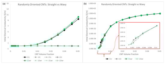 It is speculated that post the PTR, where percolation of any given realization is almost guaranteed, the efficiency of the conductive channels improves stochastically as a result of CNT waviness due to increased probability and efficiency (minimum distance between CNTs being smaller) of conductive junctions between the highly conductive CNT phases, i.e., the orientation distribution of CNT segments overall increased for the wavy cases compared to the straight cases. This means that with straight CNTs there are only N number of states that a CNT can exist in in terms of its morphology dictated only by its orientation, but with wavy CNTs there are many more number of states that a CNT can exist in on the order of as a result of its orientation as well as the orientation of individual segments of the CNT which is informed by the waviness function.