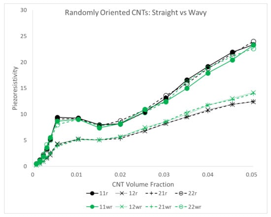 The estimate plots showing the effective non-zero components of the piezoresistivity tensor for the randomly oriented wavy case are shown in the Supplementary Materials. Comparisons to the randomly oriented straight cases are presented in Figure 29.The estimates for the non-zero components of the piezoresistivity tensor for the wavy and randomly oriented straight cases are presented in Figure 29. (The piezoresistive coefficients , , , and all exhibit scatter in their respective data sets with mean values close to zero at all CNT volume fractions for the wavy case just like all the other cases in this study with straight CNTs). There is no well defined ordering for the piezoresistive components and when making comparisons between the wavy and the randomly oriented straight cases. At the higher end of the simulated CNT volume fraction range beyond the PTR (≥2.00%), and are larger for the wavy case than the randomly oriented straight case. Similar to the higher conductivity estimates obtained for the wavy case, this may be explained with the extra pathways obtained in the wavy cases due to the increased orientation distribution of CNT segments. Overall, it is observed that the effect of waviness is marginal compared to the effect of alignment (in terms of aligned vs. randomly oriented in Figure 25) similar to the estimates obtained for engineering constants and conductivity components for the wavy case.