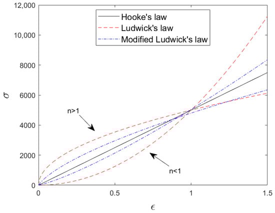 Between the nonlinear elastic theories, modified Ludwick constitutive law is proved effective in characterizing the tensile response of flax fiber-reinforced biopolymer composite [13]. This law is also an enhanced version of the original Ludwick law by remedying the defect of the stress slope going to zero or infinity when the deformation (ε) approaches 0 of the original Ludwick formulation, see Figure 1.
