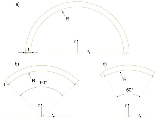 Three curved cross-sections, whose arc angles vary from 60 degrees to 180 degrees, were analyzed in this study, see Figure 3. Their moment of inertia expressions along the x-axis, using Equations (7) to (9), were developed by integrating the area moment of inertia for the ring and then applying the Parallel Axis Theorem to get the moment of inertia at the centroidal axis of the section.