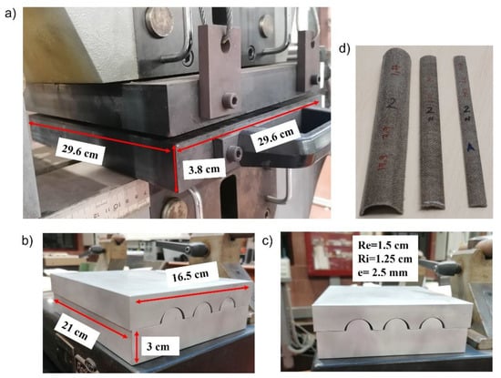 The fully biodegradable composite plates were manufactured by compression molding. Pressure was applied by a universal testing machine and temperature by two thermo-heating plates [13]. First, the flax fabrics and the PLA pellets were previously dried in the oven at 65 °C for half an hour to remove humidity. Then, 12.3 g of PLA pellets were heated and pressed in the universal machine under 180 °C for about two minutes to melt into a rectangular film of 200 × 160 mm2. Figure 4a shows the dimensions of the universal testing machine with two heated plates. Next, four layers of flax fabrics and five layers of PLA films were alternatively stacked to make a plate of 200 × 260 mm2 under 180 °C and 16MPa for five minutes (including two minutes of preheating). Finally, the compressed biocomposite plate was removed from the machine and quickly placed into the metal molds, see Figure 4b,c. The plate acquired the mold form after completely cooling to room temperature. Then, it was cut into three types of specimens: C-section 180 °C-section 90°, and C-section 60°, with the simplified nomenclature: C180, C90, and C60, respectively, Figure 4d.