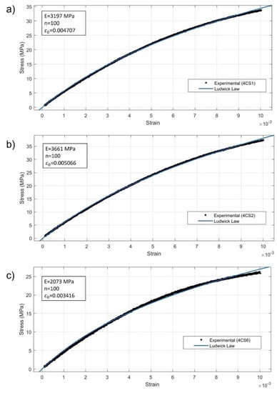 Stress–strain curves of the three representative specimens: (a) specimen number 4CS1, (b) specimen 4CS2, and (c) specimen 4CS6. Curve fitting using modified Ludwick law.