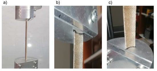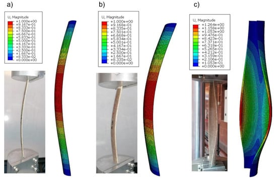 Biocomposite specimens were modeled in Abaqus/Standard as the solid deformable body. They obey the isotropic Marlow hyperelastic material model, and the experimental data obtained in the uniaxial tensile test were provided as the input. The boundary conditions were pinned–pinned to reproduce the experimental setup where the cross-section rotation was not restricted.