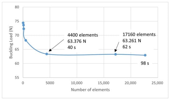 The results of a mesh sensitivity analysis conducted to check the influence of mesh size are shown in Figure 8, all the meshes were uniform. The optimal mesh for an adequate balance between the accuracy of the results and the computational cost has approximately 4400 linear hexahedral elements with reduced integration (C3D8R in Abaqus) and 9246 nodes. Moreover, there was a total running time of 40 s.