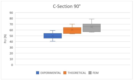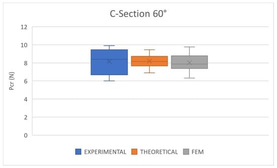 Figure 10 shows the results of the critical buckling load obtained in the experimental tests and compared with the numerical and theoretical predictions for the C60 cross-section. The results are represented in box and whisker charts showing the data distribution graphically, allowing for a more straightforward statistical analysis of the problem. The top and bottom lines represent the maximum and minimum values, the box limits indicate the upper quartile (Q3) and lower quartile (Q1), the midline represents the median, and the X mark the mean value.