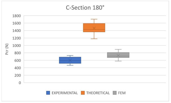 The comparative analysis shows that the analytical results are distant from the experimental data; not even the variability outside the lower quartiles is close to the experimental data. The average experimental critical buckling load is 599.17 N, while the average theoretical prediction is 1462.06 N. The boxplot shows that the theoretical predictions have a much larger average critical buckling load than the experimental results. However, the numerical approach does show better results. The average prediction of the FEM model for the C180 critical buckling load is 727.93, with an error of 21.49%. The mean error is very high but considering the dispersion of the results, there is a superposition between numerical and experimental results. The average experimental result (599.17 N) is close to the minimum numerical prediction (579.49 N) and the maximum experimental data (730 N) is near the average numerical prediction (727.93 N).