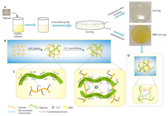 We weighed 1.2 g gelatin and 0.4 g sodium alginate into 1.0 mg/mL berberine hydrochloride solution; the mass concentration of gelatin and sodium alginate was 6% and 2%, respectively. It was stirred in a water bath at 45 °C until completely dissolved, and a uniform BBH–Gel–Alg mixed solution was obtained. The bubbles were removed by standing or ultrasonic vibration, and then an equal volume of 2% calcium chloride solution was added for crosslinking for 12 h. Finally, the surface of the hydrogel was washed with deionized water to obtain a BBH–Gel–Alg composite hydrogel. Gel–Alg hydrogel was prepared in the same way by replacing the berberine hydrochloride solution with PBS solution (Figure 1A).