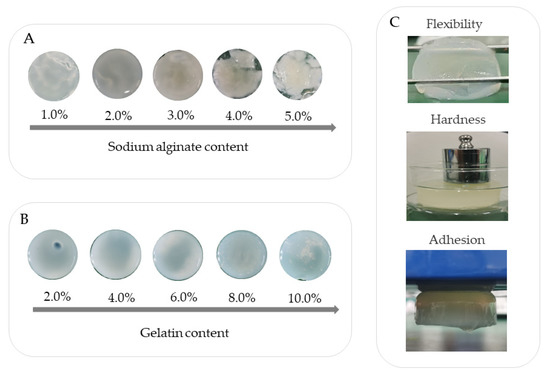 When the gelatin concentration was constant, the viscosity of the mixed solution increased with the increase of the sodium alginate concentration [34]. Since the viscosity depended on the concentration of each component of the solution and the degree of intermolecular bonding, and since both gelatin and sodium alginate are hydrophilic substances, and the two are miscible, more bonding occurs with each other, and interactions such as hydrogen bonding and electrostatic interactions also occur, increasing the viscosity of the mixed solution [35]. When the calcium chloride concentration of the crosslinking agent was 2%, as the sodium alginate concentration increased, the color of the composite gel was milky white, the transparency decreased, and the formability was poor [36,37]. The morphologies of the hydrogels with different contents of sodium alginate are shown in Figure 2A. Sodium alginate and calcium ions could crosslink quickly. When the concentration of sodium alginate was high, the crosslinking between gelatin molecules and sodium alginate molecules became close, and the viscosity of the colloid was large, which was not conducive to the crosslinking of calcium ions, thus affecting the formability of the composite hydrogel. With the increase of gelatin concentration, the transparency of the composite hydrogel increased, and the colloid was dense, high in hardness, and had good mechanical properties. The increase of gelatin concentration could effectively reduce the loss of water, so that the hydrogel had good water-holding performance. The morphologies of hydrogels containing different concentrations of gelatin are shown in Figure 2B. However, when the gelatin concentration was too high, the elasticity and toughness were relatively poor, and the stretching was easy to break.