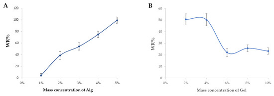 Water absorption of (A) sodium alginate and (B) gelatin with different mass concentrations.
