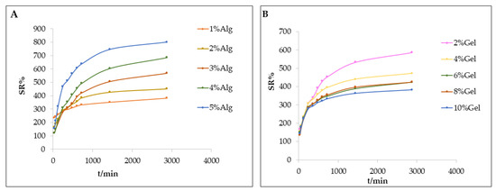 Effect of different ratios of (A) sodium alginate and (B) gelatin on the swelling property of composite hydrogel.
