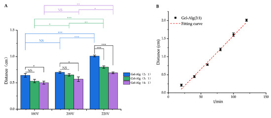 As shown in Figure 5A, the migration distance of berberine in Gel–Alg hydrogel was affected by voltage and gelatin content. With the electric field strength improving, the force received by the positively charged berberine in the electric field increased, therefore increasing the migration distance of berberine [44]. When the voltage was 180 V and 200 V, the migration distance of BBH in the Gel–Alg (4:1) was the shortest, which indicated that the higher the concentration of gelatin in Gel–Alg, the smaller the internal aperture of hydrogel, which made the berberine hydrochloride move slowly in the Gel–Alg hydrogel. Additionally, when the voltage was 220 V, the migration distance of BBH in the Gel–Alg (2:1) was the longest, which might be due to the larger pores of the Gel–Alg hydrogel. The smaller the resistance to berberine hydrochloride, the greater the displacement.
