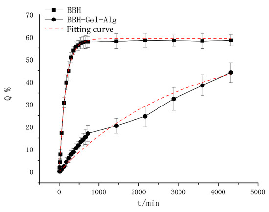 The in vitro release behavior of berberine hydrochloride was investigated based on the BBH–Gel–Alg hydrogel prepared in this experiment with a loading capacity of 0.87 mg/g. The graph with time as abscissa and cumulative drug release rate as ordinate is shown in Figure 6. The release of berberine hydrochloride from Gel–Alg hydrogel in PBS buffer solution at 37 °C (pH = 7.4) was studied in this experiment. After 72 h of simulated release in vitro, it was found that the cumulative release rate of BBH reached 60 ± 1.24% within 7 h, and then became stable and the release rate was faster. However, BBH-loaded Gel–Alg hydrogel released slowly within 72 h, and the final cumulative release rate was about 50 ± 1.68%. The drug release kinetics of BBH and BBH–Gel–Alg were studied by zero-order, first-order and Higuchi models, respectively. The correlation coefficient (R2) was the best parameter to choose the model [46]. Table 3 showed the fitting results of cumulative drug release rate of BBH and BBH–Gel–Alg. The results showed that the release of BBH and BBH–Gel–Alg were in accordance with the first-order release model, i.e., the drug was released according to a constant proportion per unit of time.