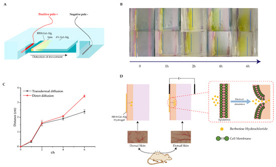 We established a model that stimulated the transdermal release of berberine hydrochloride from Gel–Alg hydrogel under the action of an electric field (Figure 7A). As shown in Figure 7B, we recorded the transdermal migration distance of berberine hydrochloride within 6 h and plotted the curve between migration distance and time. According to Figure 7C, we found that the direct migration of berberine hydrochloride was close to transdermal migration within 2 h. After 2 h, there was a difference between direct release and transdermal release. In addition, after 4 h of power, we observed the uneven distribution on the Gel–Alg hydrogel surface. The clear yellow color on the surface of the hydrogel near the positive end was due to the fluorescence property of BBH itself, while the white turbid precipitate appeared on the hydrogel near the negative end, which might be because calcium ions also moved with the current, but the appearance of white turbidity was attributed to calcium ions being insoluble in PBS. This also showed that the existence of Ca2+ made the double network structure of hydrogel more compact [52].