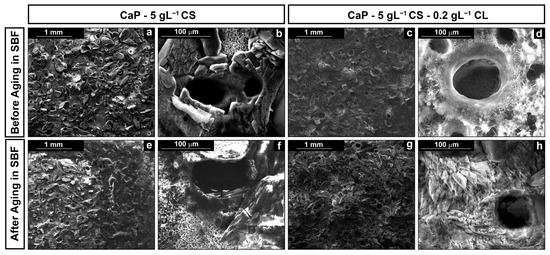 SEM images of the surface of the coatings at different magnifications: (a,b) CaP/CS and (c,d) CaP/CS/CL before aging; (e,f) CaP/CS and (g,h) CaP/CS/CL after aging in SBF.