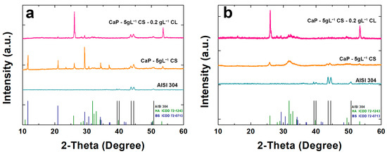 X-ray diffraction patterns of CaP/CS and CaP/CS/CL coatings: (a) before and (b) after aging in SBF. The pattern of uncoated AISI 304 was also reported for comparison.