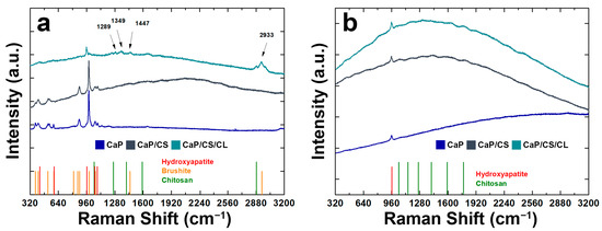 RAMAN spectra of CaP/CS and CaP/CS/CL coatings: (a) before and (b) after aging in SBF. The spectrum of the CaP coating was also reported for comparison.