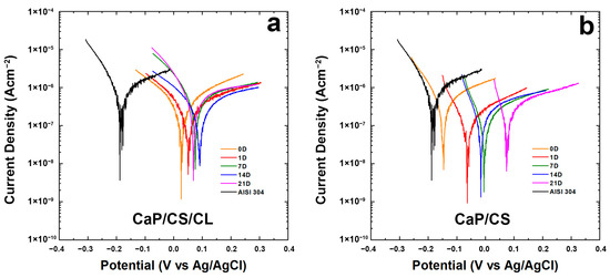 Tafel plots of the coating during 3-weeks of aging in the SBF solution: (a) CaP/CS/CL and (b) CaP/CS. Tafel curves were recorded immediately after immersion (0 D), after 1 (1 D), 7 (7 D), 14 (14 D), and 21 (21 D) days of immersion in SBF. The Tafel curve of the bare steel was also reported for comparison.