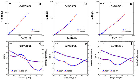 Impedance spectra of CaP/CS/CL coating during 3-weeks of aging in SBF solution: (a–c) Nyquist plots; (d–f) Bode plots. Impedance spectra were recorded immediately after immersion (0 D), after 1 (1 D), 7 (7 D), 14 (14 D), and 21 (21 D) days of immersion in SBF.