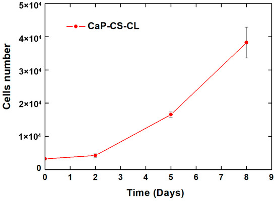 With regard to the cytotoxicity, an in vitro cellular test was carried out. The CaP/CS/CL sample was soaked in a standard medium for 24 h at an established volume-to-surface ratio according to the ISO standard [121]. MC3T3-E1 pre-osteoblastic cells were maintained in culture for seven days with this treated medium. The cellular growth curve is shown in Figure 8.