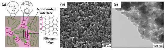 N−functionalities play an essential role in ensuring a rapid ion access into the pore structure. Pyridinic nitrogen, due to the combination of the lone pair and the π−electron system, leads to an enhancement of the ion conductivity and diffusion [48]. Thus, nitrogen exposed in the pore wall surfaces improves ion accessibility and, therefore, storage capability. In PAN−based BCPs, the interface between non−bonded PAN and PS domains contained pyridinic species that formed nitrogen−rich zigzag graphene edges (see schematic, Figure 2a) [17]. In disordered morphologies, such as those obtained here, non−bonded interfaces are predominant, guaranteeing a greater exposure of N during the electrochemical performance.