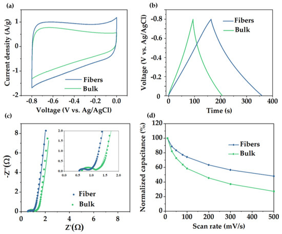 Additionally, RCT mainly depends on the electronic and ionic resistances at the interfaces and in the whole system. Values of RCT in fiber and bulk material corresponded with 0.45 and 0.60 Ω, respectively. The lower value achieved by the fibers is due to the synergistic effect of higher pore density and continuous structure, which improved the ion diffusion. Fiber presented a 50% capacitance retention at high sweep rates (500 mV/s), which is significantly higher than the 30% retention of the bulk material (Figure 5d).