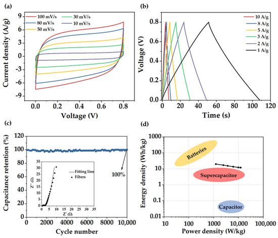 (a) CV curves at different sweep rates, (b) GCD curves at various current densities, (c) Electrode stability along 10,000 cycles at a current density of 100 A/g. Inset: EIS diagram, (d) Ragone plot of the porous carbon fibers.