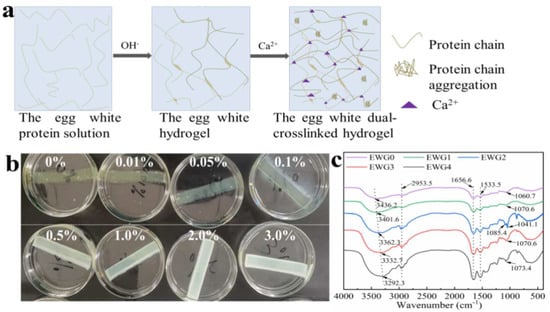 (a) Schematic of the EWG hydrogel preparation process; (b) photos of the hydrogel immersed in different concentrations of CaCl2 solution. The number represents the concentration of CaCl2 solution; (c) FT−IR spectra of the hydrogels.
