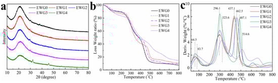 To further study the influence of calcium ions on hydrogel structure, the hydrogels were characterized by XRD, TG and DTG. The XRD spectra of the EWG0, EWG1, EWG2, EWG3 and EWG4 are shown in Figure 2a. The hydrogels exhibited distinct peaks at 2θ = 20°, which was indicated to the β-sheets secondary structure of the egg white protein. The XRD diffraction intensity of the EWG1 (5885) and EWG2 (5713) was enhanced in comparison with that of EWG0 (5233), and then the intensity decreased along with the increase in the concentration of calcium ions (EWG3:4378; EWG4:3096), confirming that the β-sheets structure in the crystalline region of the protein was disturbed by the interaction of protein with calcium ions [38,39], which was consistent with the FT−IR results.