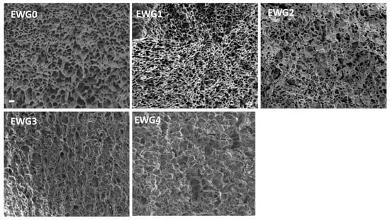 SEM was used to study the microstructure changes of the hydrogels. As shown in Figure 3, EWG0 exhibited a loose and homogeneous three-dimensional structure with lots of pores. It had been reported that protein molecule chains were able to unfold and rearrange themselves to form an ordered three-dimensional protein network under strong alkaline condition [42]. After soaking in calcium chloride, the hydrogels exhibited inhomogeneous and rough microstructure with the disordered porous structure. When the calcium ion concentration reached 1.0% and 2.0%, the porous structure of EWG3 and EWG4 was significantly reduced, accompanied by the appearance of rough, flat edges and coarse fibers (Figure S2). The results suggested that the interaction with calcium cations induced the secondary crosslinking of the protein chains and improved the degree of crosslinking, leading to the formation of more compact microstructure of the hydrogel [43,44].