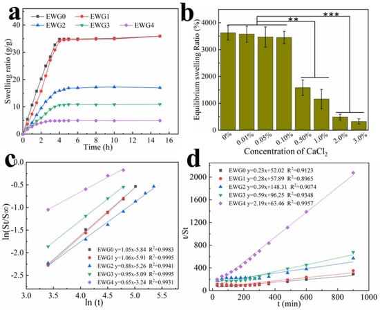 (a) Swelling kinetics of the hydrogels in distilled water at 37 °C; (b) equilibrium swelling ratio of the hydrogels in distilled water as a function of CaCl2 concentration. ** p < 0.01, *** p < 0.001; (c) plots of ln(St/S∞) versus lnt; and (d) t/St versus t for the hydrogels.