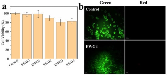 (a) Cell viability of HEK-293 cells on EWG0, EWG1, EWG2, EWG3 and EWG4 after 24 h culturing. (b) Live/dead staining florescent photographs of HEK-293 cells loaded with EWG4 for 48 h.