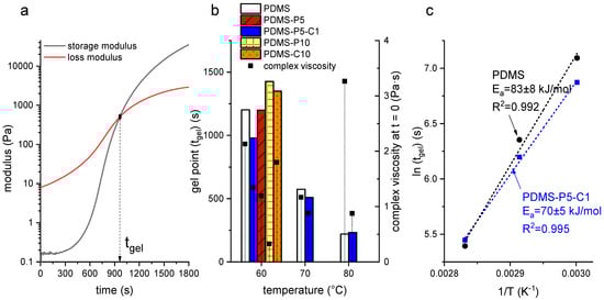 (a) Representative curve obtained in the rheological tests on uncured PDMS-P5-C1 at 60 °C; (b) gel point as a function of temperature and complex viscosity at the beginning of the test (t = 0) for some selected compositions; (c) natural logarithm of tgel as a function of 1/T (experimental data and linear regression) for the samples PDMS and PDMS-P5-C1. The calculated activation energy (Ea) and the value of R2 of the linear regression are also reported.