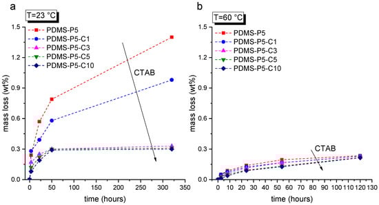 The situation at 60 °C (Figure 2b) is quite different. The paraffin leakage is considerably lower than that measured at 23 °C, as it never exceeds 0.3 wt%. This is probably due to reasons linked with the wettability and swelling of PDMS with liquid paraffin [39] and the complete immiscibility of PDMS and paraffin when the latter is in the solid state. However, further investigations must be performed to clarify this point. Nevertheless, the tests at 60 °C also evidence the positive role of CTAB in avoiding paraffin exudation and leakage.