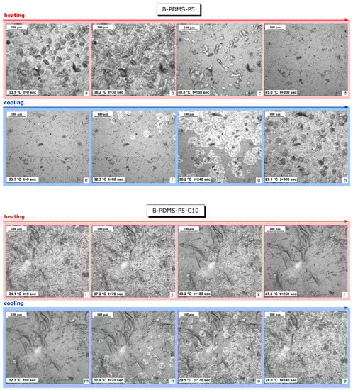 Some frames of this experiment are shown in Figure 4a–p, with each frame reporting the indication of the measured temperature and the time since the beginning of the experiment. At the beginning of the test, the sample B-PDMS-P5 (Figure 4a) shows a coarser microstructure, with paraffin crystals considerably larger than those observed on the sample B-PDMS-P5-C10 (Figure 4i), which confirms the nucleating effect of CTAB. These paraffin domains start melting while the temperature raises, until they completely disappear above approx. 45 °C (Figure 4d,l), in good agreement with DSC results. During cooling, the paraffin domains start appearing below approx. 32 °C for both compositions, but the cooling time is longer for the sample without CTAB, with the paraffin coverage being completed after 300 s (Figure 4h) vs. the 240 s of the sample B-PDMS-P5-C10 (Figure 4p). Therefore, although the starting and finishing melting and solidification temperatures are not remarkably affected by the presence of CTAB, the surfactant decreases the time required to complete the solidification upon free cooling to room temperature, i.e., samples with CTAB become fully opaque faster than those without.