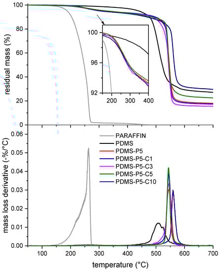 where is the mass loss at 350 °C measured on each sample, is the mass loss at 350 °C measured on neat PDMS, and is the weight fraction of PDMS in the sample. The tests also allowed the measurements of the temperatures corresponding to the beginning of the thermal degradation, i.e., the temperatures at values of mass loss of 1 wt% and 3 wt% (), of the temperature at the maximum degradation kinetics, i.e., the peak temperature of the mass loss derivative (), and of the residual mass after the test ().
