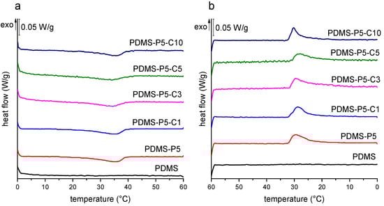 Figure 6a,b shows the DSC thermograms of the first heating scan and the cooling scan of some selected bulk samples, while the most important DSC results are reported in Table 4. Neat PDMS does not show evident thermal transitions in the investigated temperature interval, while the thermogram of neat paraffin (not shown but similar to that reported in [25]) exhibits an endothermic melting peak in the heating scans, at 43.7 °C, and an exothermic crystallization peak in the cooling scan, with peak temperature at 27.3 °C. The same melting and crystallization events of paraffin are observable also in the prepared bulk samples (Figure 6a,b), but at slightly different temperatures; both events are slightly anticipated, as melting occurs at lower temperatures, i.e., 35–39 °C, and crystallization at higher temperatures, i.e., 29–32 °C. Therefore, the working interval is slightly modified compared to that of the neat paraffin, which must be taken into account when choosing the PCM for a target application.