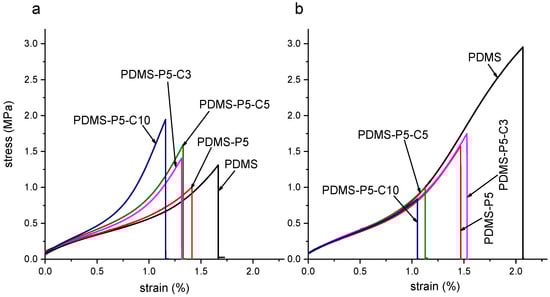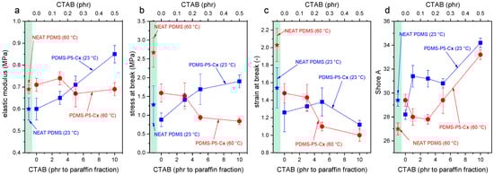 The addition of 5 phr of paraffin (sample F-PDMS-P5, CTAB = 0 phr) leaves the elastic modulus unaltered but decreases the stress and strain at break (Figure 8). This occurs both at 23 °C and 60 °C, but the effect is more evident when the paraffin is in the liquid state. For example, at 23 °C the stress at break decreases from 1.28 MPa of neat PDMS down to 0.88 MPa of PDMS-P5 (−31%), while at 60 °C the stress at break decreases from 2.67 MPa to 159 MPa (−40%). In any case, these decreases are less remarkable than those obtained by Sales et al. [40], who registered a decrease of 82% in the tensile strength and of 37% in the strain at break with the addition of only 1 wt% of paraffin.