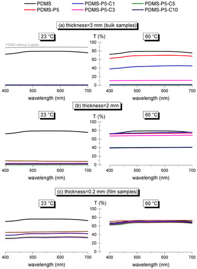 Transmittance as a function of the wavelength at 23 °C and 60 °C for samples of variable thickness. All tests were performed with a K-glass substrate (see Section 2.3).