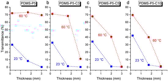 Values of transmittance at 550 nm (at 23 °C and 60 °C) of the samples PDMS-P5-Cx (x = 1–10 phr compared to paraffin), as a function of their thickness.