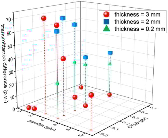 If these systems are used to produce thermal/optical sensors, a good performance parameter could be the difference between the transmittance measured at 60 °C and that measured at 23 °C, which must be maximized. For example, Figure 11 shows the transmittance difference at 550 nm for all the investigated compositions, i.e., , as a function of the composition (paraffin and CTAB amounts) and the sample thickness. The highest values of , measured in percentage points (p.p.), are reached for paraffin amounts of 3 to 5 phr, CTAB amounts of max. 0.15 phr, and intermediate thickness (i.e., 2 mm). The only four samples with a higher than 60 p.p. are the 3-mm-thick B-PDMS-P3 and B-PDMS-P5, with a of 72.6 p.p. and 69.2 p.p., respectively, and the 2-mm-thick PDMS-P5, PDMS-P5-C1, and B-PDMS-P5, with a of 64.9 p.p., 73.3 p.p. and 66.9 p.p., respectively. Since the leakage tests showed that the minimum amount of CTAB that prevented paraffin exudation was 3 phr compared to paraffin and that a certain paraffin loss may still happen during processing and in the first hours, the most suitable composition for application in the thermal/optical sensing may be the 2-mm-thick PDMS-P5-C3. The samples with these compositions show better optical performance than similar systems recently reported in the literature [40], which show a transmittance difference at 550 nm of only 15–20 p.p., mostly because they do not reach a low transmittance below the transition temperature.