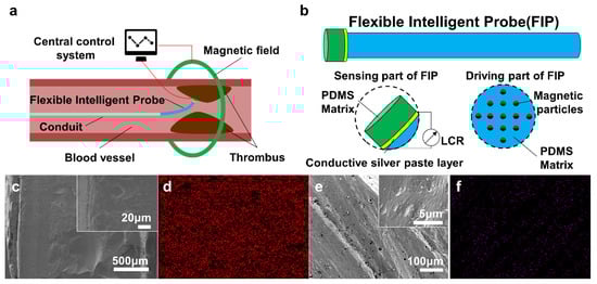 Model and characterization of the flexible intelligent probe (FIP). (a) Working model diagram of FIP, (b) Composition model diagram of FIP, (c) SEM images of cross-section of the piezo-resistive sensing part, (d) Element distribution of the piezo-resistive sensing part, (e) SEM images of cross-section of the magnetic driving part; (f) Element distribution of the magnetic driving part.