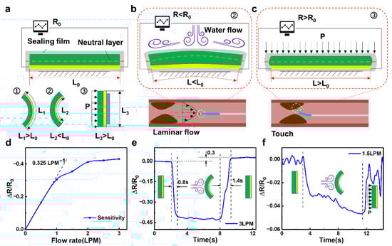 The flow sensing performance mechanism can be valued by the sensitivity equation of S = d(ΔR/R0)/dv, where ΔR is the changing resistance value, R0 is the initial resistance value and v is the flow velocity. A curve of the relative resistance change of the PRS part with the flow velocity is measured and is shown in Figure 2d, and the sensing performance curves for different flow rates are shown in Figure S3. In the low flow rate range (0–1 L per minute (LPM)), the PRS part shows a quasi-linear sensitivity to the flow rate of approximately 0.325 LPM. The higher sensitivity in the low flow rate range is mainly due to the good elastic deformation of the PDMS substrate, which deforms well in a linear fashion and causes a change in resistance. As the flow rate continues to increase, the sensitivity of the device gradually is decreased due to the degree of elastic deformation beyond the linear deformation, which is influenced by the elastic resistance of the PDMS material but is still able to differentiate sensing for different flow rates.