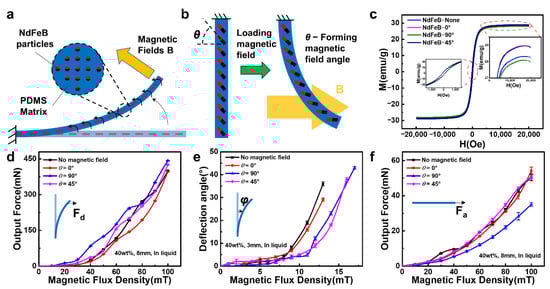 The motion mechanism of the MD part of the FIP is relatively straightforward and is driven by the interaction between the driving magnetic field and the hard magnetic particles (NdFeB particles) dispersed in the polymer matrix (PDMS matrix) (Figure 3a). The PDMS matrix containing the NdFeB particles can be divided into multiple magnetic polymer units. In a magnetic field, the driving force can be thought of as a magnetic torque, and the magnetic polymer unit is subjected to the magnetic torque to generate movement and deformation, which ultimately results in the movement of the MD part of the FIP. As the actuating magnetic field is much smaller than the saturation field, the magnetization of the magnetic polymer units (voxels) is independent of the actuating magnetic field. As shown in Figure 3b, as the FIPs are molded under different magnetic fields, the internal magnetic particles are arranged in different directions, which results in different output forces and deflection angles when a directional magnetic field is applied.
